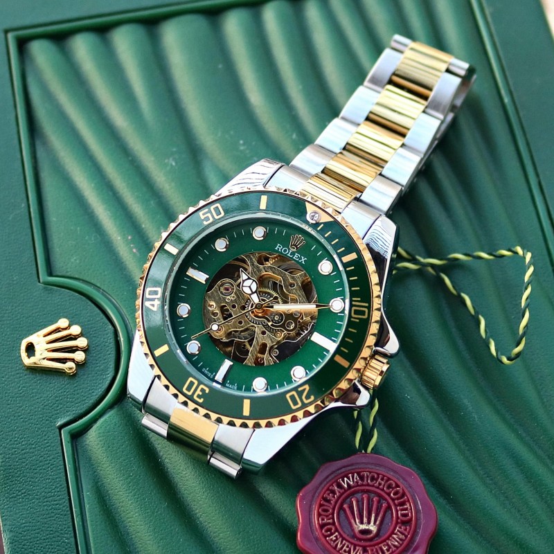 # Rolex # For Men # 7AA Premium Collection # Submariner Skeleton Face Automatic Series # Dial Size - 41mm # Features follows - *AN AUTOMATIC MECHANISM IN 3 LINK LUXURY BELT* ?? - Working Automatically - 12 Hour analog - Date counter - Water resistant - *Stainless steel 3 Link Luxury Gold Silver wrist adjustable bracelet* - Luxurious Green Open Heart dial - Heavy original Rolex double buckle lock - *Original Japanese Automatic smooth movement machinery* ??